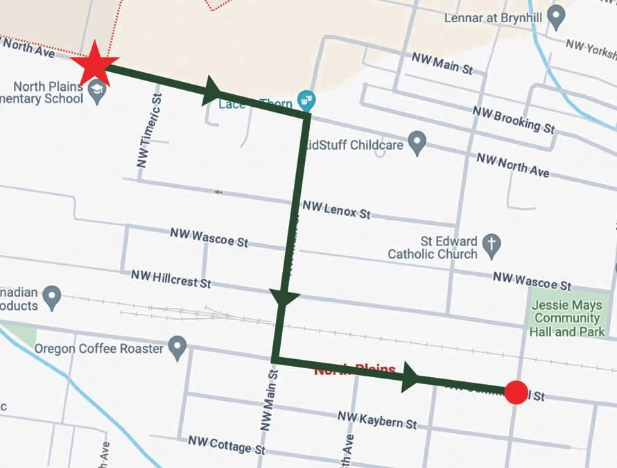Parade starts at North Plains Elementary, turns South on Main Street, then East on Commercial Street. Yes, we will throw candy!