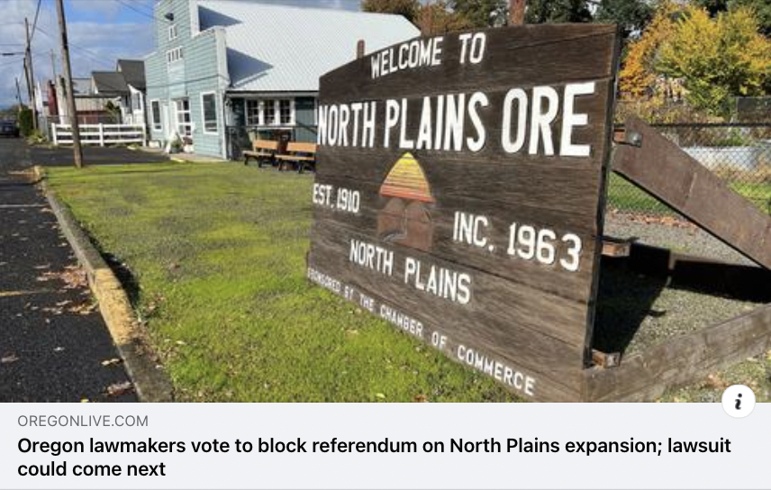 Last night may have been a victory, but it is one small step in a larger legal problem. Governor Kotek, pushed on by Senator Sollman and the North Plains leaders, passed a bill making this Vote all but meaningless. The controversial bill passed in the 2024 short session (House Bill 4026) limits public oversight of city expansion plans (urban growth boundaries). The bill applies retroactively, affecting proposals dating back to 2023, and was rushed through the Capitol after the referendum voted on last night was filed. That Bill is being challenged in State Court by the 1000 Friends of Oregon and others. There have also been legal challenges by the City about having this vote on the ballot and counting it. Now that it has been counted, the Mayor will likely direct the City Attorney to try and block the vote certification. Let’s see how much she wants to reach her hand out to the 72% of her people who told her NO last night. Let’s see.